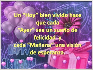 Un mensaje de cumpleaños desea a Pyly una vida llena de esperanza y felicidad, recordando que vivir el presente hace que el pasado sea un sueño y el futuro una visión positiva. Los amigos desean a Pyly un feliz cumpleaños con todo su cariño.