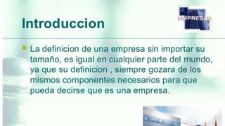 El documento habla sobre las pequeñas y medianas empresas (PYMES) en el Perú. Explica que las PYMES son empresas con un número reducido de trabajadores y ingresos moderados. También define el Producto Interno Bruto (PIB) como la medida del valor monetario de los bienes y servicios finales producidos en un país en un período determinado, generalmente un año. Además, explica que la renta per cápita es el PIB dividido por la población de un país.