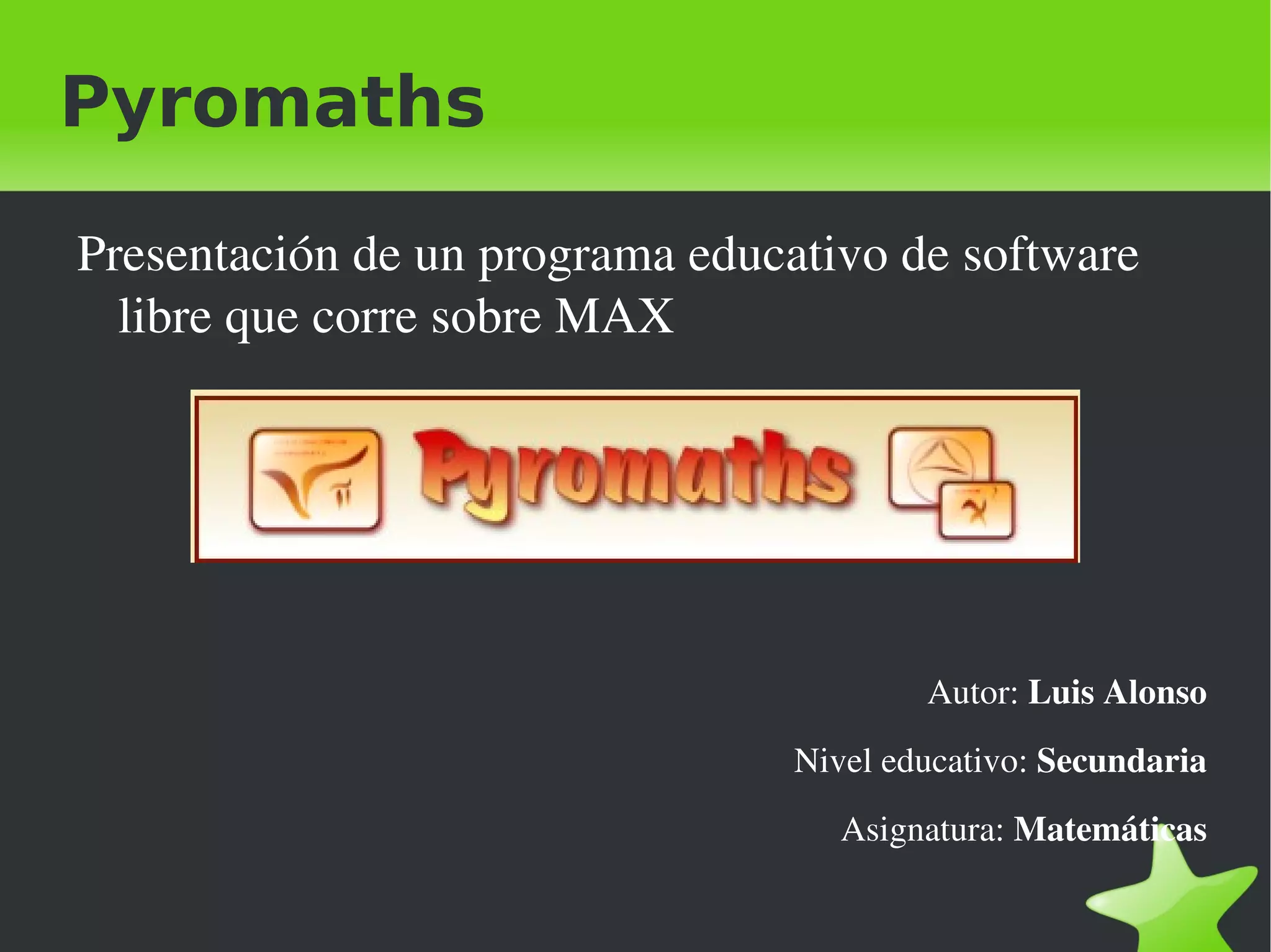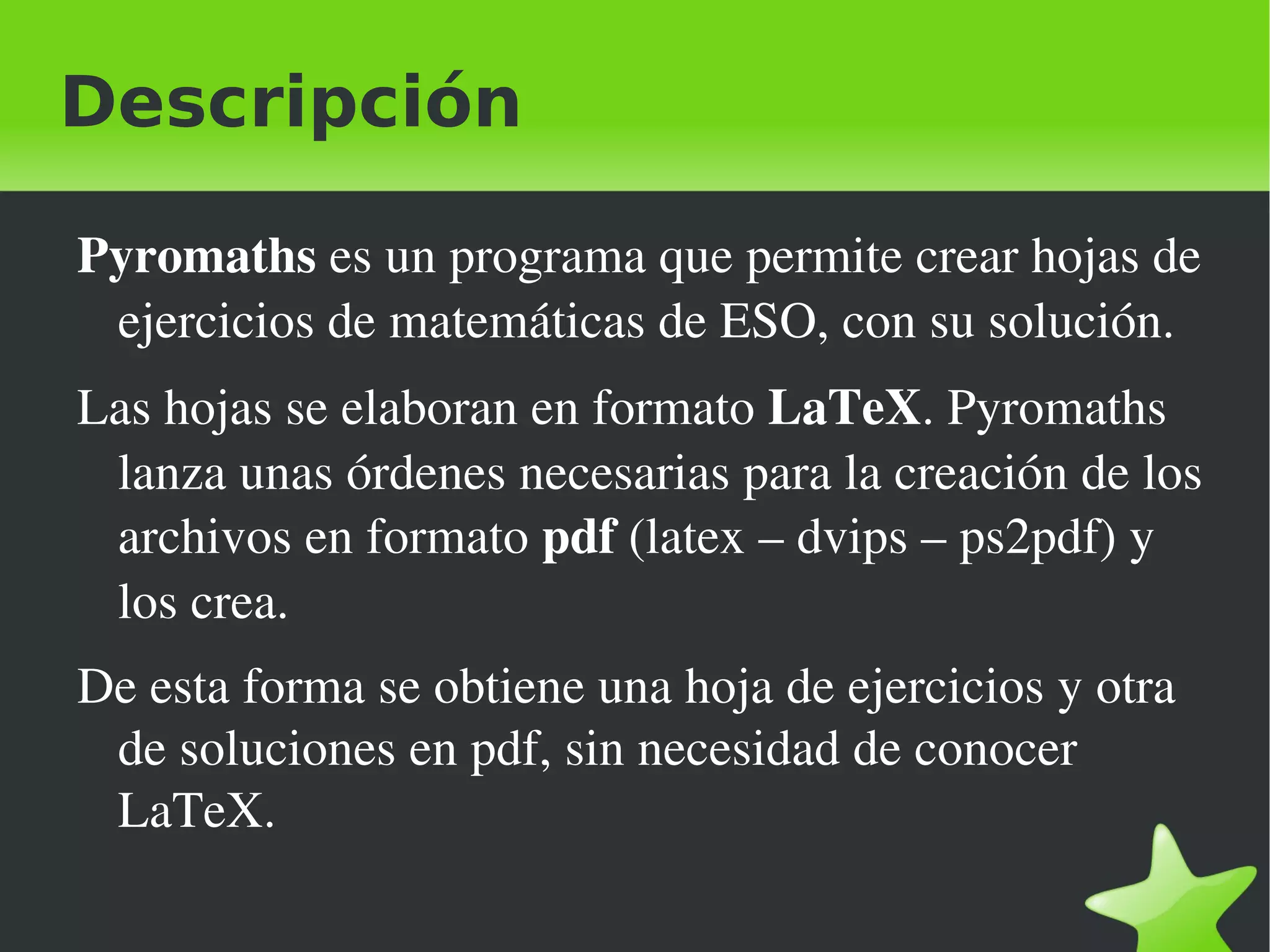 Este documento presenta Pyromaths, un programa educativo de software libre para crear hojas de ejercicios de matemáticas de secundaria en formato LaTeX sin necesidad de conocimientos previos. Pyromaths genera automáticamente hojas de ejercicios y soluciones en PDF a partir de la selección del curso, tipo y número de ejercicios. El documento explica cómo instalar y usar Pyromaths, concluyendo que es una herramienta útil para crear hojas de ejercicios.