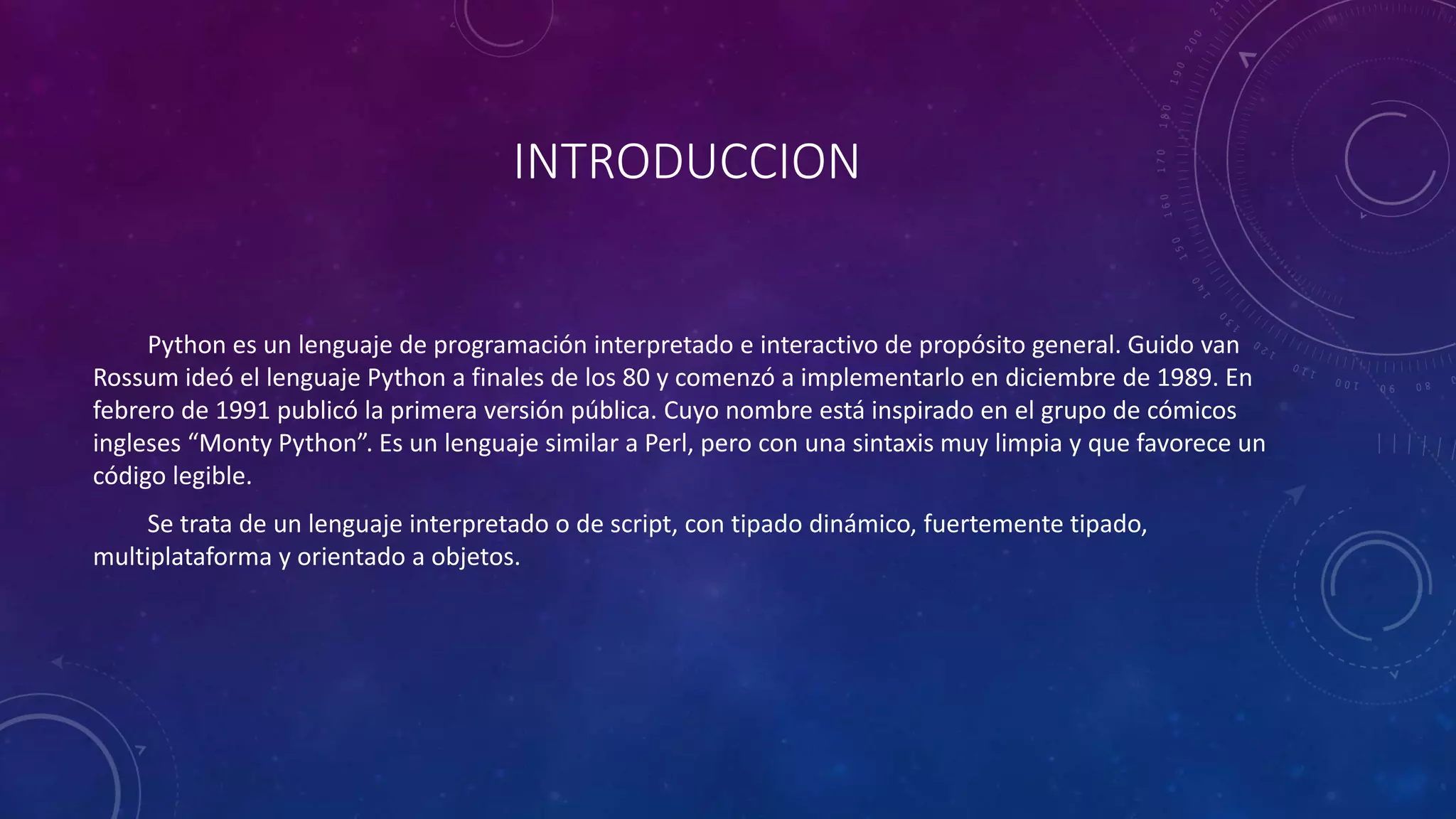Python es un lenguaje de programación interpretado y de propósito general creado por Guido van Rossum, lanzado en 1991, que ha ganado popularidad por su sintaxis limpia y su amplia biblioteca de recursos. Ha demostrado ser el lenguaje más utilizado en la evaluación de programadores y es preferido en la enseñanza de ciencias de la computación. Su adopción por grandes empresas de tecnología y su desarrollo continuo respaldan su relevancia en la actualidad.