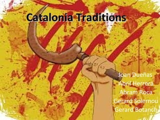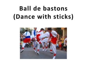 El documento describe varias tradiciones catalanas como el baile de bastones, la sardana, los castellers y la Patum. El baile de bastones es una danza tradicional donde los bailarines golpean los bastones de los demás. La sardana es el baile nacional de Cataluña donde hombres y mujeres bailan en círculo. Los castellers construyen torres humanas de varios niveles. La Patum es un festival tradicional de Berga conocido por sus fuegos artificiales y comida típica.