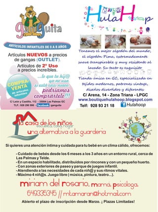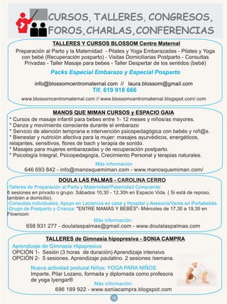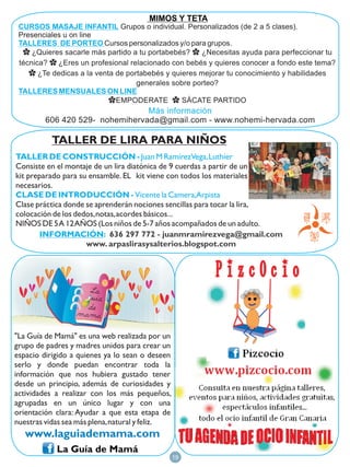 El documento contiene información de contacto de varias empresas y servicios relacionados con fisioterapia y actividades relacionadas en Las Palmas. Incluye números de teléfono y enlaces a sitios web de los servicios mencionados. Además, se mencionan redes sociales para seguir las actualizaciones de los servicios.