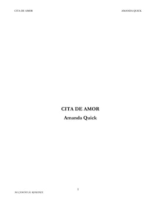 Este documento presenta el prólogo y el primer capítulo de la novela "Cita de amor" de Amanda Quick. Narra cómo la protagonista Augusta Ballinger es descubierta por el conde Graystone mientras intenta abrir el escritorio de su anfitrión en la biblioteca, buscando el diario de otra mujer. A pesar de sus excusas, Graystone deduce sus verdaderas intenciones. Augusta siente una misteriosa atracción por el conde aunque sus personalidades son opuestas.