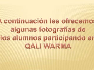 Qali warma es un programa del MIDIS que brinda servicio alimentario y educación nutricional a niños de instituciones educativas públicas de nivel inicial y primaria. El programa busca mejorar la asistencia escolar, hábitos alimenticios y participación comunitaria a través de una alimentación balanceada y educación sobre nutrición. Qali warma se basa en cinco pilares como actividad física, educación alimentaria, quioscos saludables, mejora de salud y promoción de alimentos saludables.