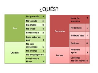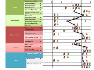 Este documento presenta un análisis QFD (Calidad Funcional Desglosada) para el diseño de un pan y un chantillí. Incluye una lista de atributos deseados como no quemarse, tener buen sabor, y consistencia firme. Luego evalúa los ingredientes y procesos clave para lograr esos atributos, y establece objetivos cuantitativos para cada uno. Finalmente, realiza un benchmarking de competidores.
