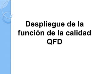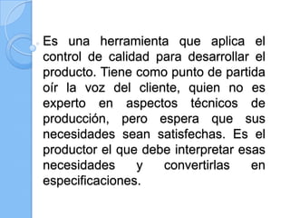 El QFD es una herramienta que aplica el control de calidad para desarrollar productos teniendo en cuenta la voz del cliente. Tiene cinco pasos básicos que van desde conocer los requisitos del cliente hasta determinar los requerimientos de producción. Utiliza matrices para trasladar los requerimientos del cliente a través de las distintas etapas del desarrollo del producto.