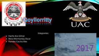 Este documento resume la festividad de Qoyllorritty, una celebración andina que rinde homenaje a Cristo y a los apus o dioses de las montañas. La festividad involucra varias danzas tradicionales, como Qapac Qolla y Qoyacha, y comparsas que bailan al son de melodías específicas. Las comunidades se organizan meses antes para ensayar las coreografías. Los pablitos "ukukus" mantienen el orden durante las ceremonias y castigan a quienes no obedecen. Final