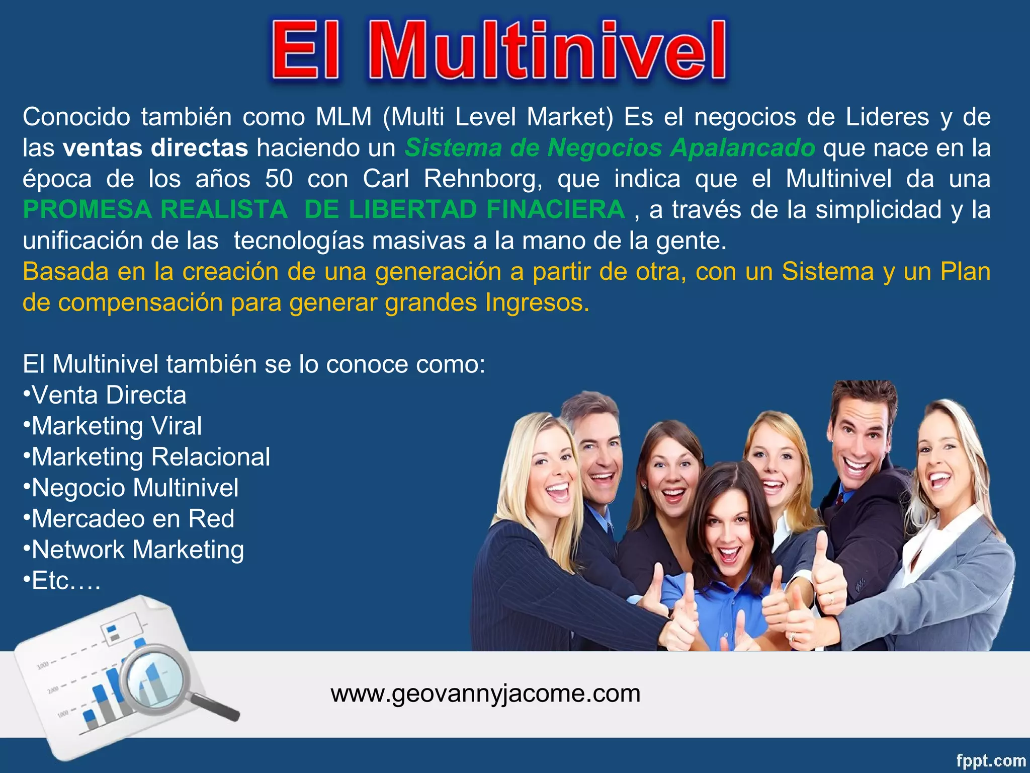 El documento explica brevemente qué es el multinivel, también conocido como MLM. Se trata de un sistema de negocios de ventas directas que promete libertad financiera a través de la creación de redes generacionales para generar ingresos. El multinivel permite a los distribuidores independientes ganar un porcentaje de las ventas a través de su red de mercadeo.