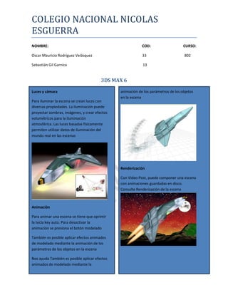 3ds Max 6 es un programa de modelado 3D y animación que permite crear objetos, materiales, luces, cámaras y animaciones. Los objetos se pueden modelar a partir de formas geométricas básicas o importadas y luego modificar. Los materiales se definen para darle apariencia realista a los objetos. Las luces y cámaras se agregan para iluminar y ver la escena. El programa permite crear y editar escenas 3D complejas.