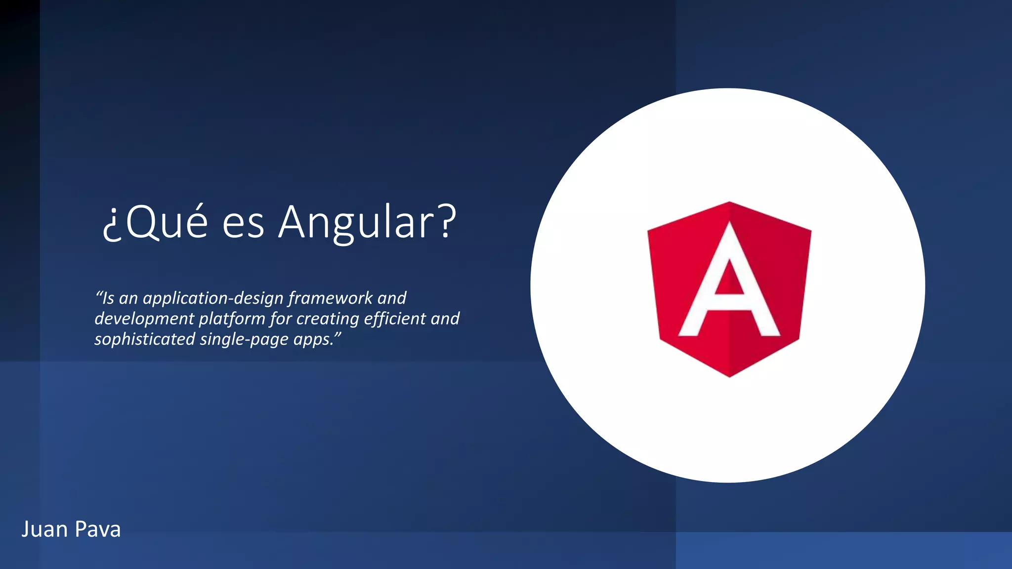 Angular es un framework y plataforma de desarrollo para crear aplicaciones de una sola página eficientes y sofisticadas. Usa TypeScript, arquitectura MVC con componentes que combinan vistas y controladores, e inyección de dependencias para facilitar el desarrollo y mantenimiento de aplicaciones escalables.