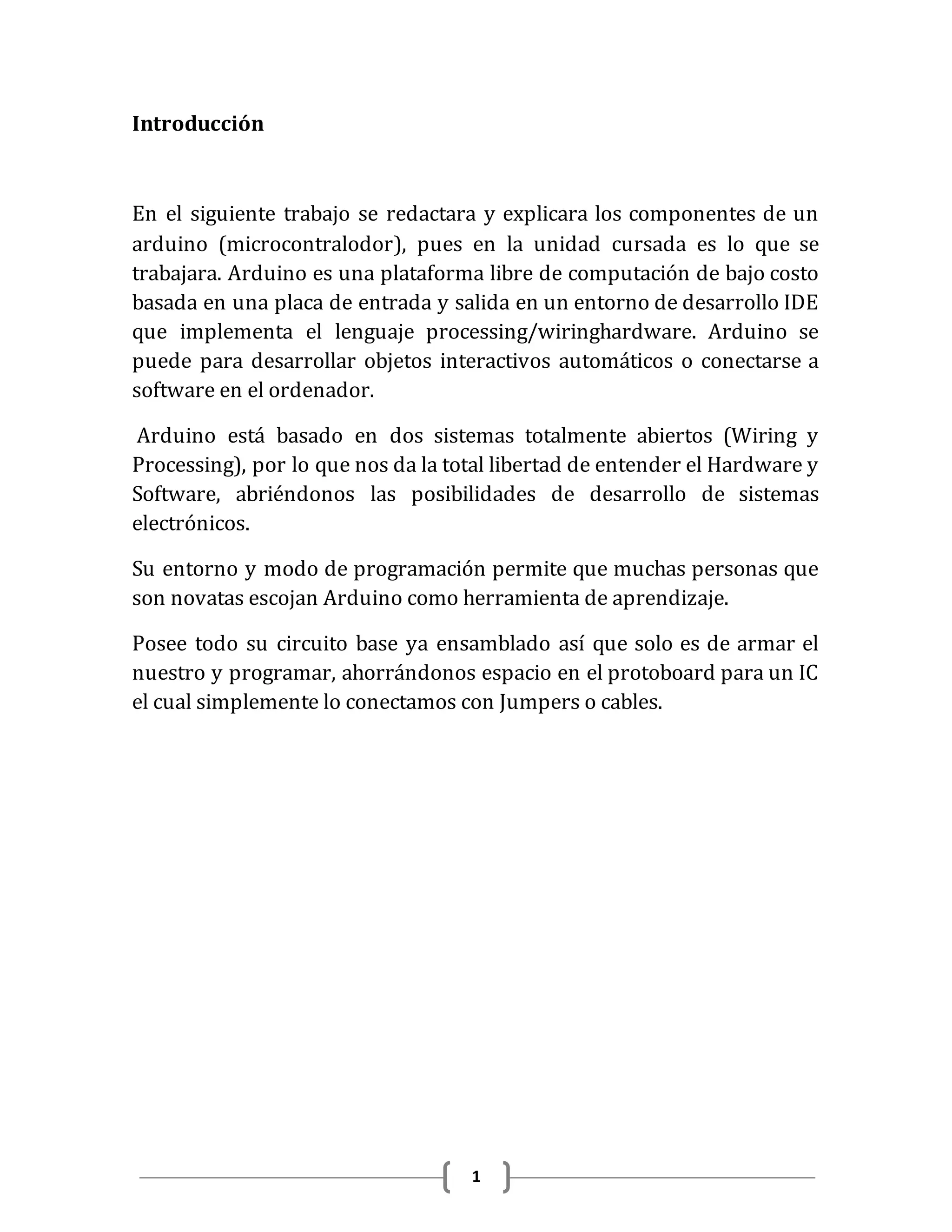 Este documento presenta una introducción general sobre Arduino. En primer lugar, define Arduino como una plataforma de hardware y software libre basada en una placa que incorpora un microcontrolador programable y pines de entrada y salida. Luego, explica que Arduino se puede utilizar para desarrollar objetos interactivos o conectarse a software en una computadora. Por último, señala que Arduino está basado en sistemas abiertos y que su entorno de programación permite que personas novatas lo usen como herramienta de aprendizaje.