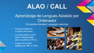El documento aborda el aprendizaje de lenguas asistido por ordenador (ALAO), su evolución desde los años 60 hasta la actualidad y las etapas de su desarrollo: conductista, comunicativa e integradora. Destaca la importancia del rol del tutor y del alumno en este proceso, así como las ventajas y desventajas de los métodos de enseñanza actuales. Se mencionan herramientas y recursos modernos que facilitan el aprendizaje, como tutoriales y juegos educativos.