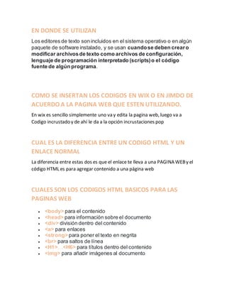 El HTML es el código que se utiliza para estructurar y desplegar páginas web, permitiendo incluir contenido como párrafos, listas, imágenes y tablas. HTML especifica la estructura de las páginas web y requiere de un editor de texto para acceder y modificar el código fuente. Los editores de texto permiten crear y editar archivos de texto plano como el código HTML.