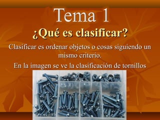 Clasificar es ordenar objetos siguiendo un criterio objetivo y discriminador, como se muestra en la imagen donde los tornillos están clasificados por su tamaño y tipo.
