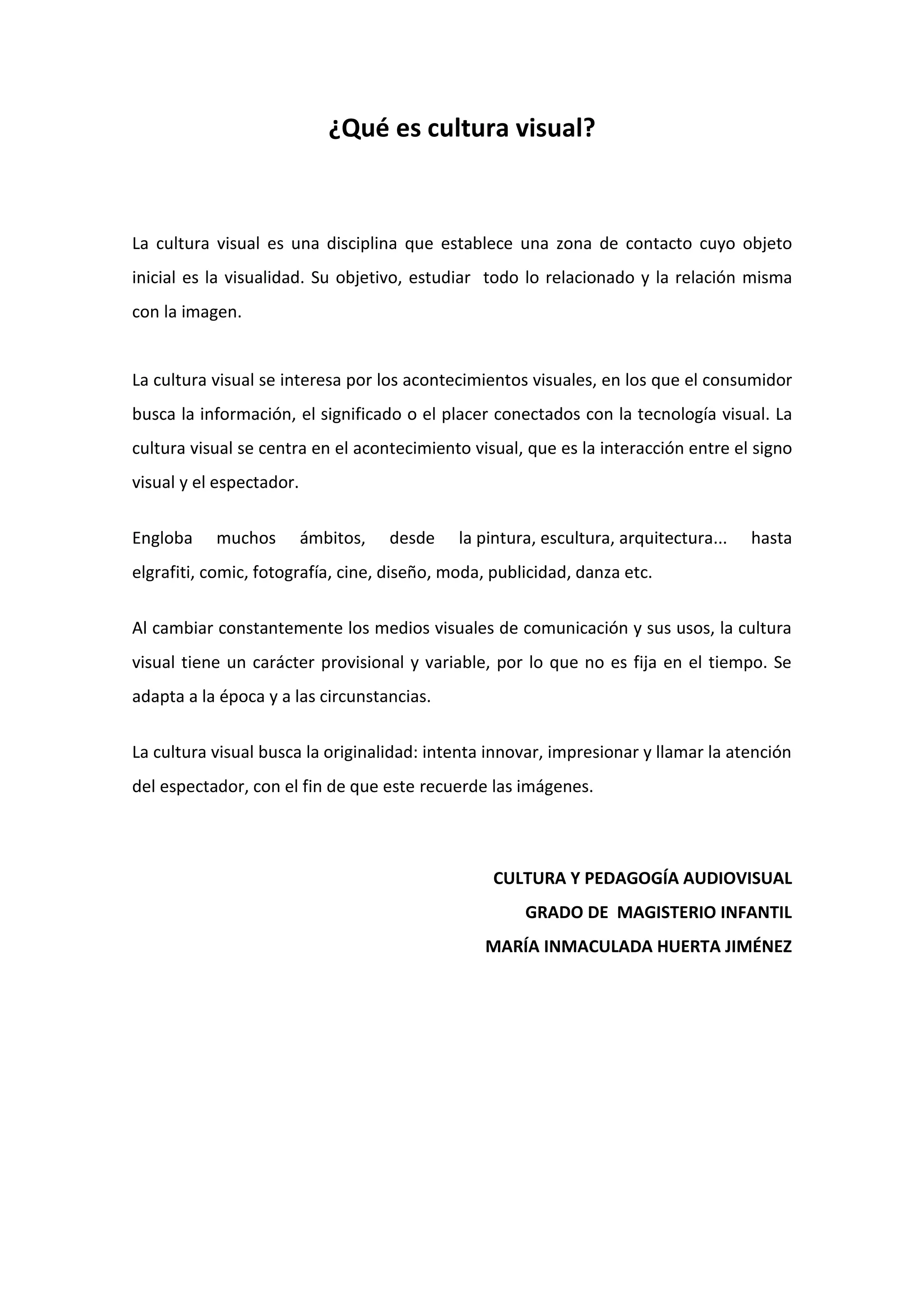 La cultura visual es una disciplina que estudia la visualidad y la relación con las imágenes. Se centra en los acontecimientos visuales y la interacción entre signos visuales y espectadores. Aborda ámbitos como la pintura, escultura, arquitectura, grafiti, fotografía, cine y publicidad. Al cambiar constantemente los medios visuales, la cultura visual tiene un carácter variable y se adapta a cada época.
