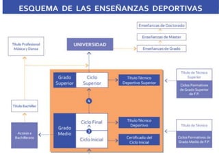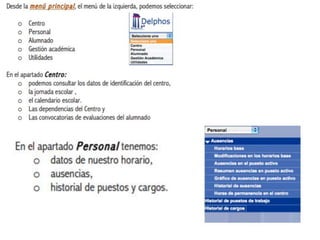 El documento detalla el uso del sistema Delphos para la gestión educativa en educación secundaria, destacando las limitaciones de acceso a información según la asignación de grupos. También abarca las enseñanzas deportivas en Castilla-La Mancha, describiendo sus niveles, requisitos de acceso y la relación entre centros privados y públicos. Finalmente, se mencionan diversas especialidades deportivas y recursos adicionales para formación.