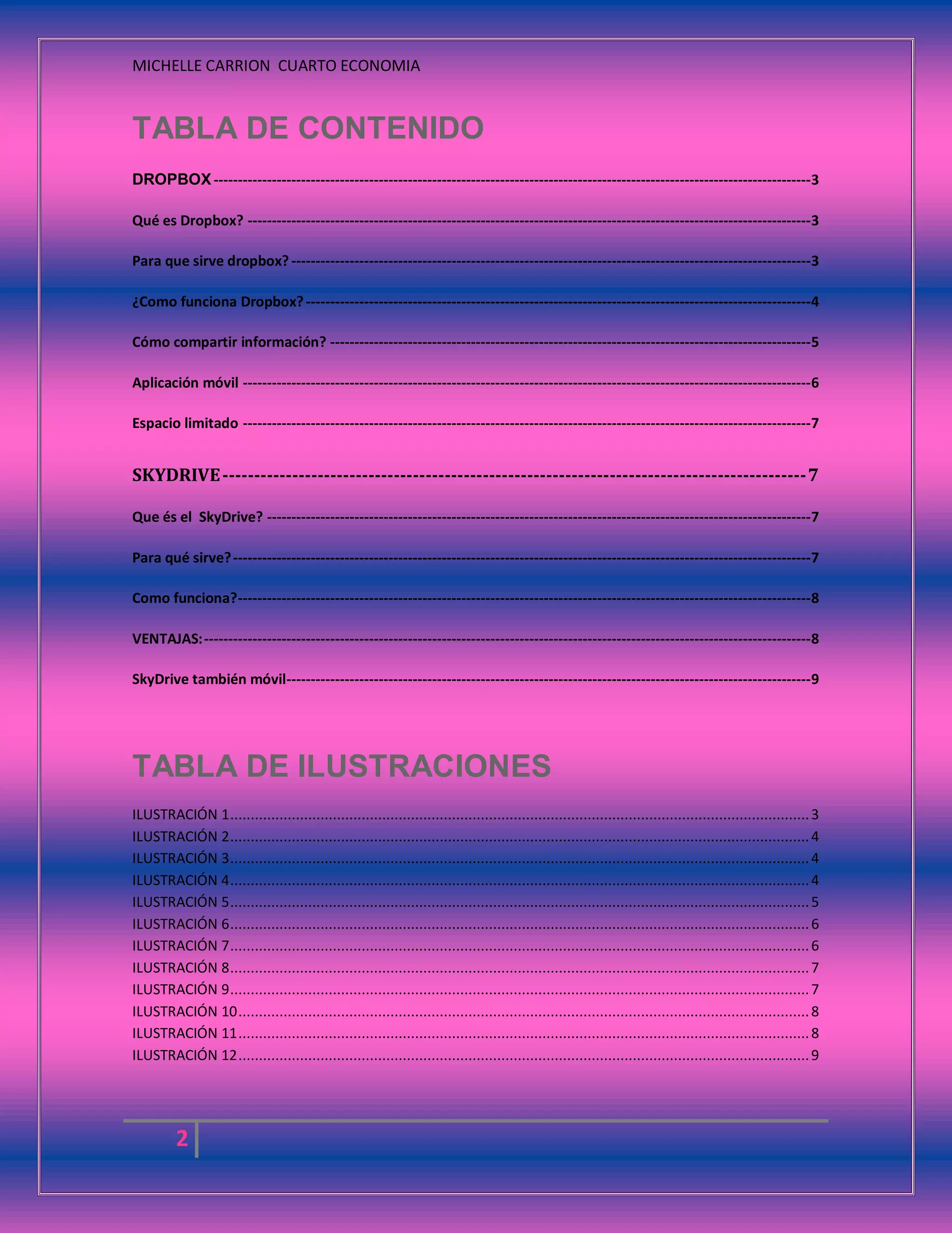 Este documento describe y compara dos servicios de almacenamiento en la nube, Dropbox y SkyDrive. Dropbox permite sincronizar archivos a través de un directorio virtual en la red para tener acceso a los archivos desde cualquier ordenador. SkyDrive es un servicio de Microsoft que permite almacenar documentos, hojas de cálculo y presentaciones en la nube para acceder a ellos desde cualquier lugar. Ambos servicios tienen aplicaciones móviles que permiten el acceso a los archivos desde dispositivos móviles.