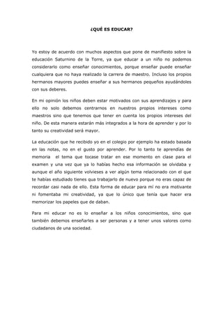 Educar no es solo enseñar conocimientos, sino también motivar a los niños y tener en cuenta sus intereses. La educación debe fomentar la creatividad en lugar de centrarse únicamente en las notas. Educar significa enseñar valores y preparar a los niños para ser ciudadanos responsables de la sociedad.