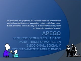 Las relaciones de apego son vínculos afectivos cruciales entre niños y cuidadores. Influyen en el desarrollo emocional y social del niño. Relaciones de apego seguras con cuidadores sensibles promueven un mejor desarrollo, mientras que relaciones inseguras con cuidadores insensibles pueden causar problemas.
