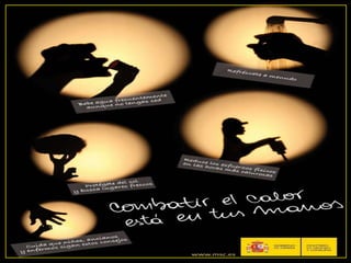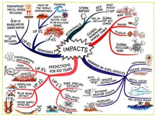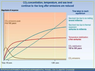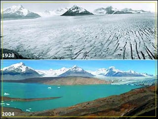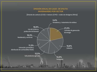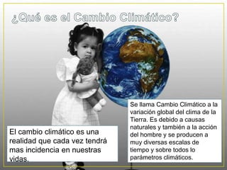 El documento habla sobre el cambio climático, incluyendo sus causas naturales y humanas como la quema de combustibles fósiles, y sus efectos como el aumento de las temperaturas y el nivel del mar. España es uno de los países más afectados por el calentamiento global y se espera un aumento significativo de las temperaturas. Protocolos internacionales como el de Kioto y la Cumbre de Copenhague han abordado la reducción de emisiones de gases de efecto invernadero.