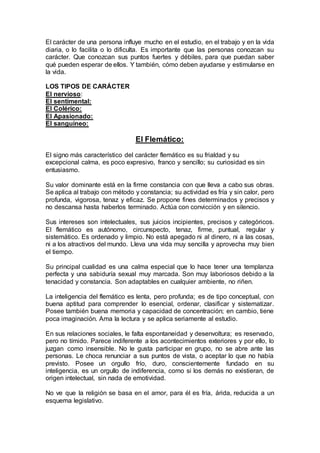 1. El documento describe el carácter flemático, el cual se caracteriza por ser tranquilo, ordenado y reflexivo.