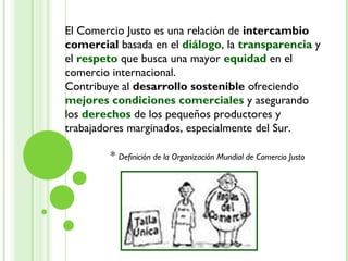 El documento describe la evolución del comercio justo a través de tres generaciones, comenzando con un sobreprecio para mejorar la calidad de vida de los productores, luego sellos de garantía para certificar procedencia y calidad, y finalmente una fusión organizacional entre productores y facilitadores para crear un mercado alternativo y solidario. También define conceptos clave como desarrollo humano, equidad, comercio justo y sostenible, trazabilidad y comercio ético.