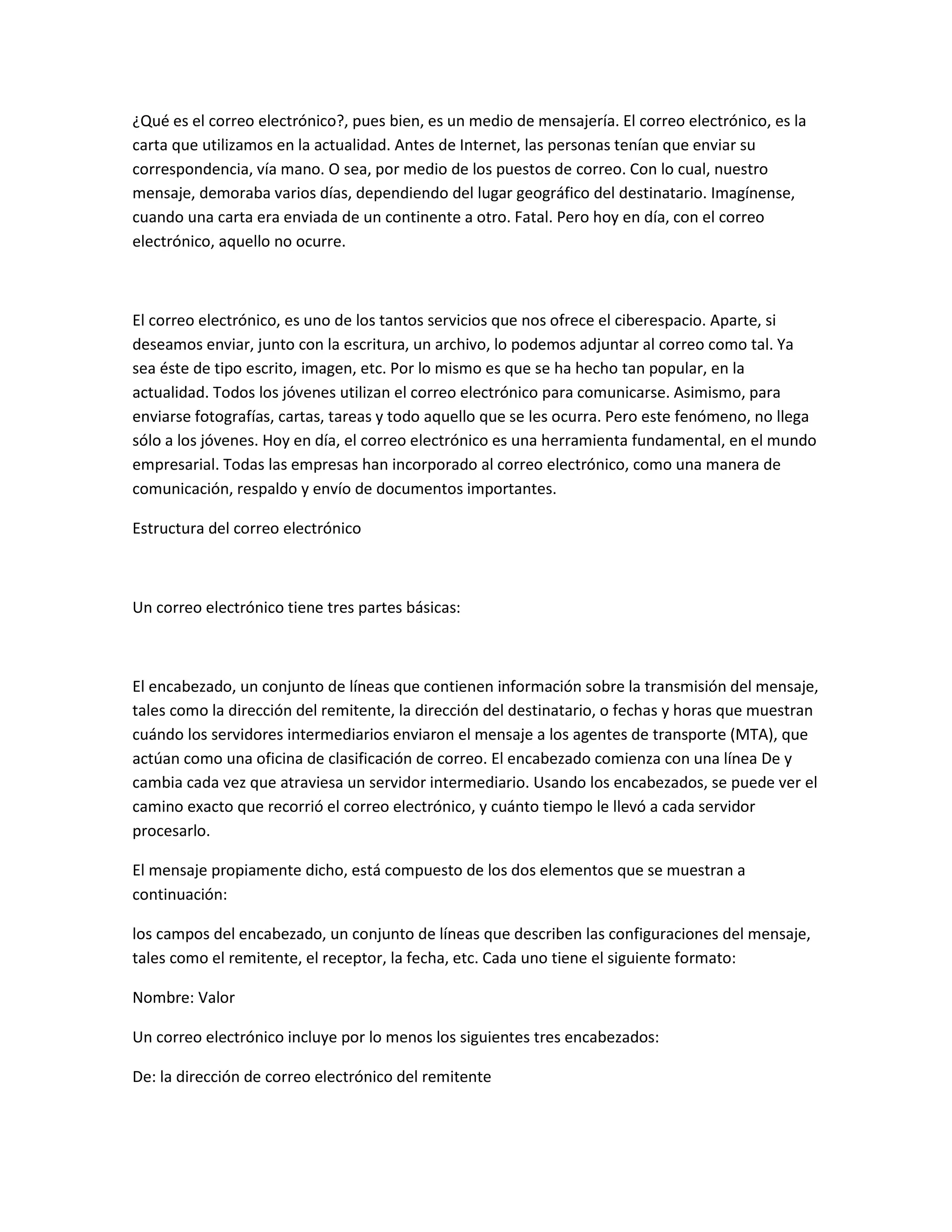 El documento describe el correo electrónico, su historia, estructura y uso. Explica que el correo electrónico permite enviar mensajes de forma casi instantánea a nivel mundial, a diferencia del correo físico que podía demorar días. Detalla que tiene tres partes: encabezado, mensaje y cuerpo. También explica las funciones de las opciones "Para", "CC" y "CCO" al enviar correos. Brevemente describe las redes sociales, sus características de comunicación y su función social de conectar a las personas.