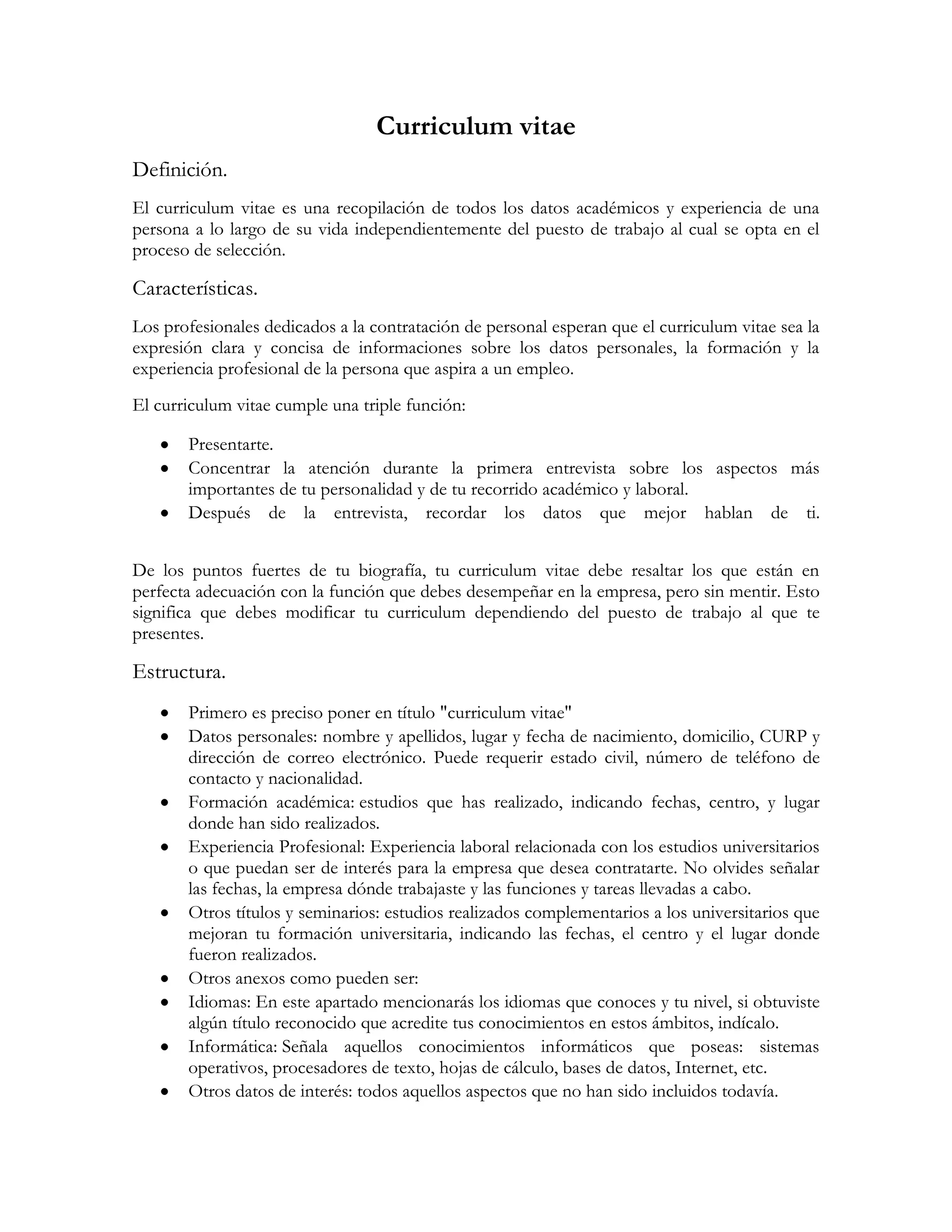 El documento define el curriculum vitae como una recopilación de los datos académicos y experiencia laborales de una persona a lo largo de su vida. Explica que el CV tiene tres funciones: presentarse, concentrar la atención en los aspectos más importantes durante la entrevista, y recordar datos después de la entrevista. Además, detalla que la estructura típica de un CV incluye secciones de datos personales, formación académica, experiencia profesional, otros títulos y seminarios, idiomas, informática, y otros datos de interés
