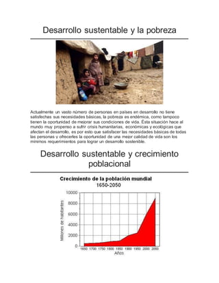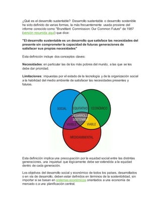 El desarrollo sustentable se define como satisfacer las necesidades del presente sin comprometer la capacidad de las futuras generaciones para satisfacer las suyas. Este concepto surgió en 1987 y desde entonces ha sido el principio rector para el desarrollo mundial a largo plazo, buscando un equilibrio entre el desarrollo económico, social y ambiental. En 1992 y 2002, cumbres mundiales adoptaron planes de acción para implementar el desarrollo sustentable a nivel nacional, regional e internacional.