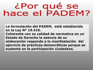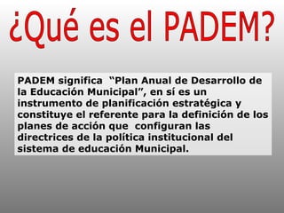 El PADEM es el Plan Anual de Desarrollo de la Educación Municipal, que establece las directrices de la política educativa municipal y requiere la participación ciudadana. Sirve para planificar los procesos educativos locales, abrir espacios de participación ciudadana, y abordar problemas para mejorar la calidad de la educación. Todos los estamentos educativos y la comunidad pueden participar a través de un sitio web para entregar opiniones y ayudar a formular el plan de acción anual.