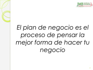 El plan de negocio es el proceso de pensar la mejor forma de hacer un negocio. Sirve para decidir si conviene hacer el negocio, dirigir el negocio, y conseguir financiamiento. Consiste en responder preguntas sobre concepto, productos, mercado, competencia, finanzas, operaciones, equipo, legales y riesgos del negocio. Es la hoja de ruta que todo empresario debe tener.