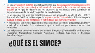 El SIMCE es una evaluación externa que mide los logros de aprendizaje en el currículo nacional, implementada desde 1988 y usada por la Agencia de Calidad de la Educación desde 2012. Proporciona información sobre el rendimiento de los estudiantes en diversas asignaturas y se complementa con datos de docentes y familias para mejorar la educación. Además, evalúa indicadores de desarrollo personal y social que abarcan aspectos como autoestima académica y hábitos de vida saludable.