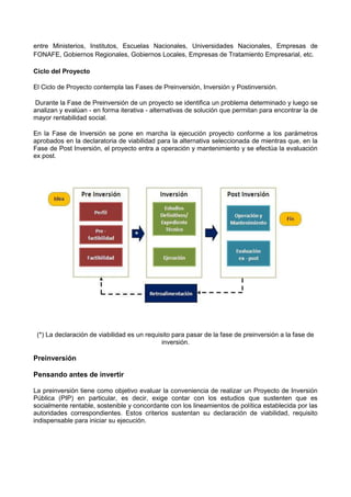 El documento explica el Sistema Nacional de Inversión Pública (SNIP) de Perú. El SNIP certifica la calidad de los Proyectos de Inversión Pública a través de principios, métodos y normas para lograr eficiencia, sostenibilidad e impacto socioeconómico. Los proyectos pasan por fases de preinversión, inversión y postinversión con diferentes actores como Unidades Formuladoras, Oficinas de Programación e Inversiones y Unidades Ejecutoras.