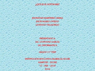 El documento define el software como el soporte lógico de un sistema informático que permite realizar tareas específicas a través de aplicaciones y el sistema operativo. Explica que el software incluye programas, datos y la información procesada por los sistemas operativos. Además, describe tres tipos principales de software: software de aplicación, software de programación y software de sistemas.