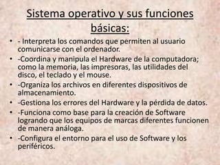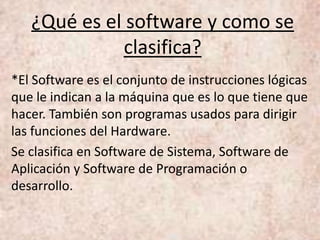 El documento describe los diferentes tipos de software, incluyendo sistemas operativos como Windows, Linux y Mac OS. Explica que el software se divide en software de sistema, software de aplicación y software de programación. También describe conceptos básicos como bytes, código ASCII y papelera de reciclaje.