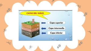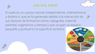 El documento define el suelo como un cuerpo natural tridimensional formado por la interacción de factores como el clima, la topografía y los organismos a lo largo del tiempo. Explica que el suelo está compuesto principalmente por materia orgánica e inorgánica y se compone de tres capas: la capa inferior de rocas, la intermedia de agua, arcilla y arena, y la superior de mantillo, aire y agua. Además, destaca la importancia ambiental del suelo en funciones como la producción de biomasa y la regulación medioambiental