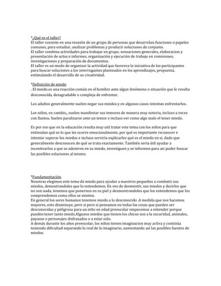El documento trata sobre un taller realizado sobre los miedos de los niños. En el taller, las organizadoras conversaron con los niños participantes para identificar sus miedos comunes, como oscuridad, animales e imaginarios. Luego utilizaron imágenes para analizar las emociones y finalmente los niños dibujaron y propusieron formas de ayudarse mutuamente a superar sus miedos con el apoyo de los demás.