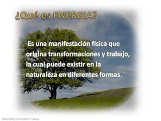 El documento describe los diferentes tipos de energía, incluyendo la energía termoeléctrica, geotérmica, nuclear, hidroeléctrica, mareomotriz, eólica y solar. Explica cómo se genera energía en cada sistema mediante el uso de calor, vapor, agua, viento u otros recursos naturales para hacer girar turbinas y generar electricidad. Además, detalla los pasos de generación, transmisión y distribución de la energía eléctrica que consumimos.