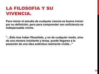Este documento define y describe la filosofía. Explica que la filosofía se origina de la curiosidad natural del ser humano por comprender el mundo. Se divide la filosofía en tres concepciones: metafísica, crítica y positivista. También explora las preguntas fundamentales de la filosofía y sus divisiones principales como la lógica, ética y ciencias naturales.