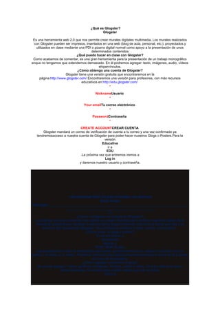 Glogster es una herramienta web 2.0 que permite crear murales digitales multimedia llamados "glogs" o "posters" a los que se les puede agregar texto, imágenes, audio, videos e hipervínculos. Los usuarios obtienen una cuenta gratuita en la página web de Glogster y pueden crear un glog eligiendo el fondo y agregando variados contenidos multimedia.