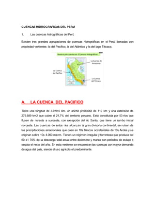 El documento describe la hidrografía de Perú. Explica que Perú tiene tres grandes cuencas hidrográficas: la del Pacífico, la del Amazonas y la del lago Titicaca. Describe los ríos más importantes de cada cuenca y su importancia para la agricultura, comunicación y otras actividades económicas.