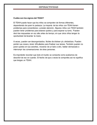 Este documento describe la hiperactividad y el trastorno por déficit de atención con hiperactividad (TDAH). Explica que el TDAH se caracteriza por problemas para prestar atención, hiperactividad e impulsividad. Afecta al 6-8% de los niños y es más común en niños que en niñas. Los signos incluyen dificultad para concentrarse, no poder estarse quieto, ser desorganizado y olvidadizo. No hay una causa conocida, pero se cree que está relacionado con diferencias en el funcionamiento