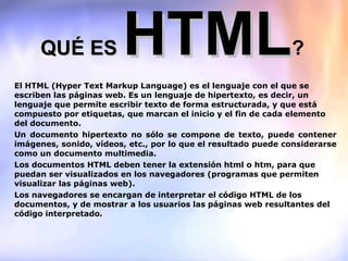El documento explica que HTML es el lenguaje utilizado para crear páginas web. Consiste en etiquetas que definen la estructura y contenido de una página, la cual puede incluir texto, imágenes, video y sonido. Los navegadores interpretan el código HTML para mostrar la página al usuario.