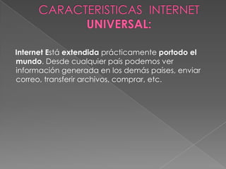 Este documento describe los elementos básicos necesarios para conectarse a Internet y algunas de las actividades más comunes que se pueden realizar en línea, como enviar correo electrónico, participar en chats, foros y blogs. Explica que Internet proporciona acceso rápido y de bajo costo a una gran cantidad de información y servicios desde cualquier lugar del mundo.