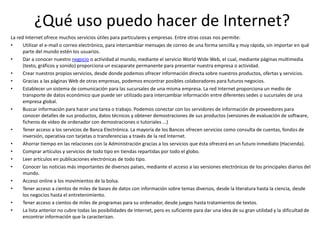 Internet es una red de redes que interconecta computadoras y redes de computadoras a través de diferentes medios como cable coaxial, fibra óptica o líneas telefónicas. La World Wide Web es una colección de documentos electrónicos vinculados entre sí almacenados en servidores alrededor del mundo, y ha evolucionado hasta convertirse en un medio global de publicación y comercio electrónico. Los servidores almacenan y entregan páginas web a petición de los clientes como los navegadores a través del protocolo