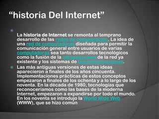 Internet es una gran red internacional de ordenadores que permite compartir recursos e información entre usuarios de todo el mundo. Se originó en la década de 1960 como la red ARPANET del Departamento de Defensa de EE.UU. y ha crecido para convertirse en una "red de redes" a nivel mundial. Los usuarios se identifican a través de direcciones únicas como nombresy dominios asignados por el sistema DNS. Las herramientas básicas que ofrece Internet incluyen el correo electrónico, el acceso a páginas web y la conexión