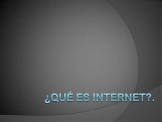 Internet es una gran red internacional de ordenadores que permite compartir recursos e información entre usuarios de todo el mundo. Se originó como ARPANET en los años 1960 para propósitos militares y académicos en Estados Unidos y ha crecido exponencialmente hasta convertirse en una red de redes que conecta millones de dispositivos. Los usuarios se identifican a través de direcciones únicas y los tres servicios básicos que ofrece Internet son el correo electrónico, el acceso remoto a otros ordenadores y la transferencia de archivos.