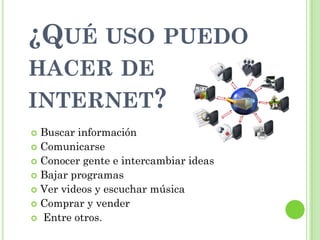 Internet es una red global que conecta computadoras y dispositivos a través de la cual se puede compartir información de todo tipo, como música, arte, literatura y más. La World Wide Web (WWW) permite acceder a documentos hipertextuales enlazados a través de Internet usando un navegador web. Los usuarios pueden buscar información, comunicarse, descargar programas y contenido multimedia, comprar y vender, entre otros usos.