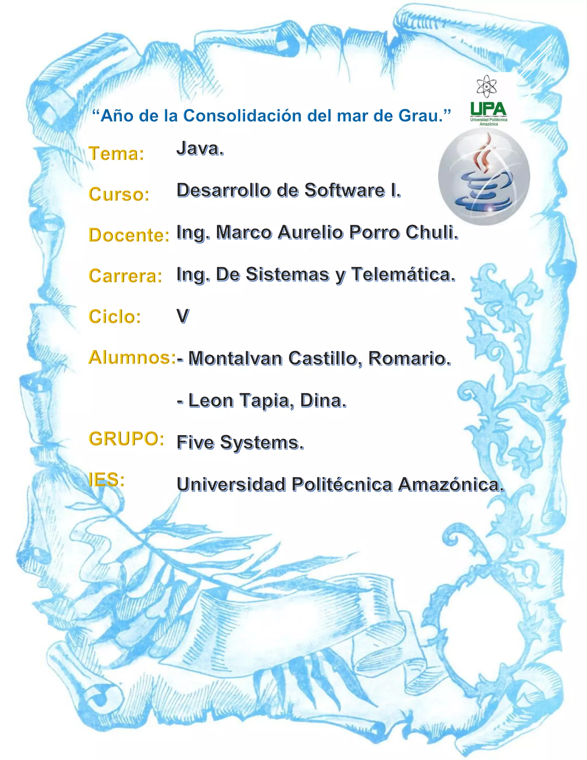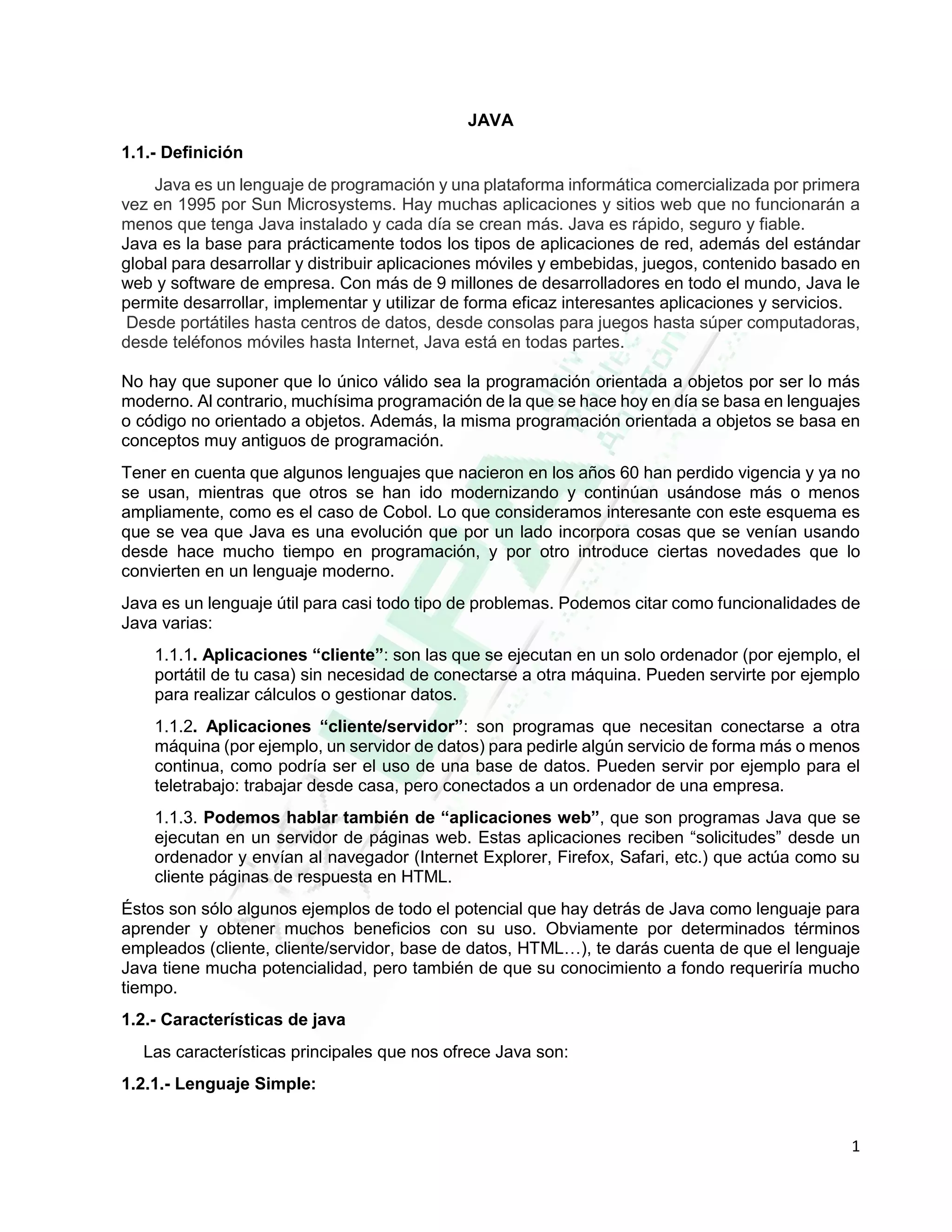 Java es un lenguaje de programación y una plataforma informática lanzada en 1995, fundamental para muchas aplicaciones y sitios web. Se caracteriza por ser simple, orientado a objetos, robusto, seguro y portátil, trabajando con tipos de datos primitivos y de objetos, además de diversos operadores. Java es ampliamente utilizado en el desarrollo de aplicaciones que funcionan en múltiples plataformas sin necesidad de recompilación.