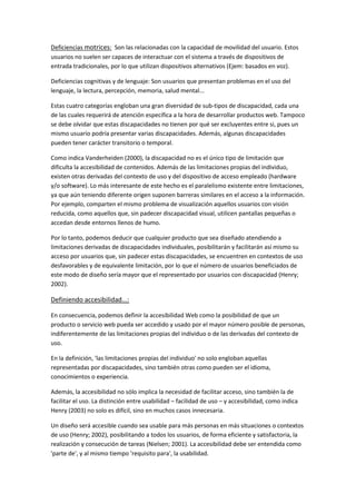 Este documento define la accesibilidad web como la posibilidad de que un sitio web pueda ser accedido y utilizado por el mayor número posible de personas, independientemente de las limitaciones individuales o del contexto de uso. Explica que la accesibilidad es importante debido a que un alto porcentaje de la población tiene algún tipo de discapacidad o limitación, y que los sitios web suelen tener barreras que dificultan el acceso. También describe los principales tipos de discapacidades (visuales, auditivas, motrices y cognitivas) y cómo afect
